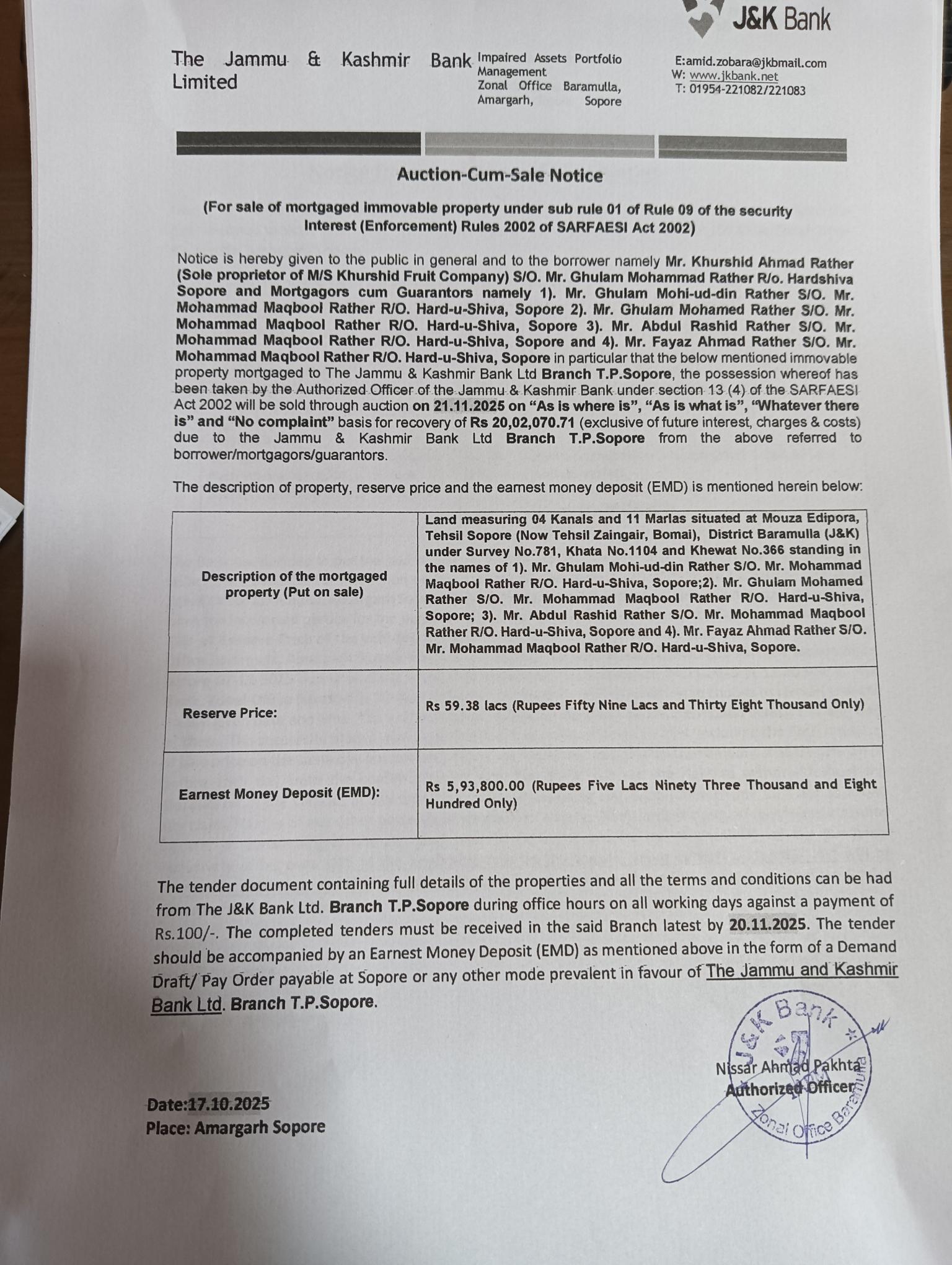 M/S Khursheed Fruit Co. of BU T.P. Sopore – Land Auction Notice