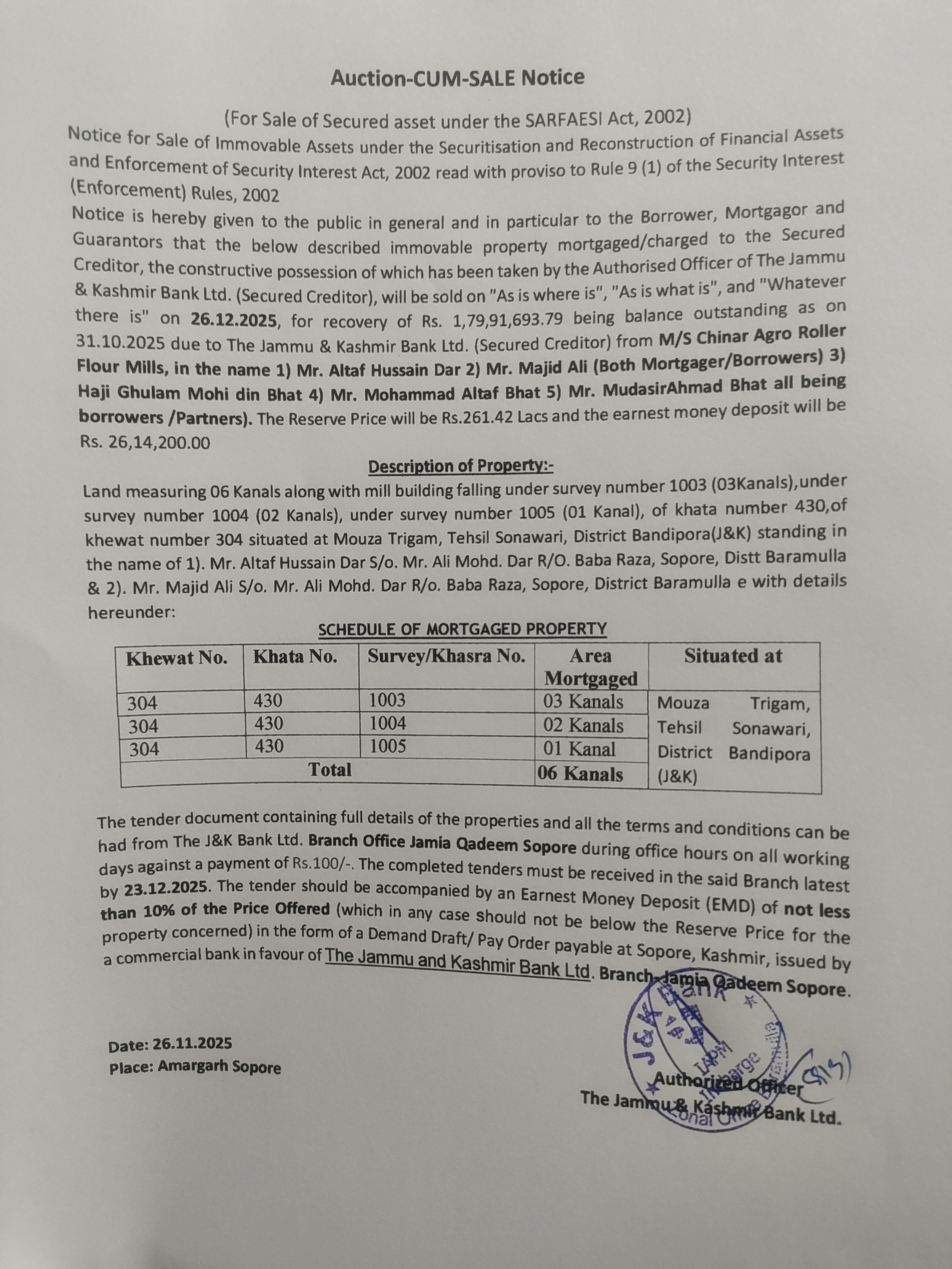 New E-auction notices in NPA accounts of Jehangir Ahmad Naikoo Branch Office Pinjura, Shopian