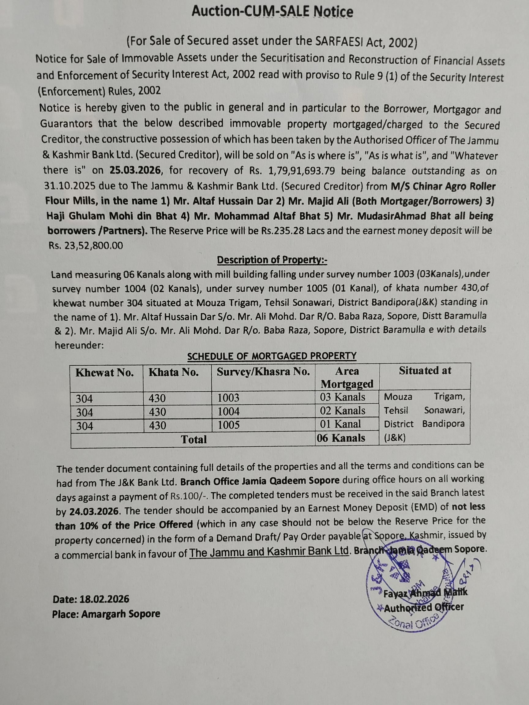 New Auction of NPA Account Mudasir Ahmad Allie s/o Ghulam Nabi Allie R/O Maldera Shopian