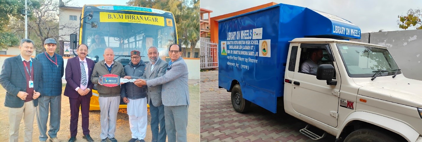 As part of its focus on inclusive and accessible education, J&K Bank supported Bhartiya Shiksha Samiti by enhancing infrastructure at its schools located in Kathua (Jammu region) and Choglamsar (Leh). A dedicated school bus was provided to the Kathua campus to facilitate the daily commute of students from surrounding villages. Meanwhile, a "Library on Wheels" was introduced for the Leh school, allowing students from remote areas to access educational resources. This mobile library also supports literacy promotion through outreach to communities lacking library infrastructure.