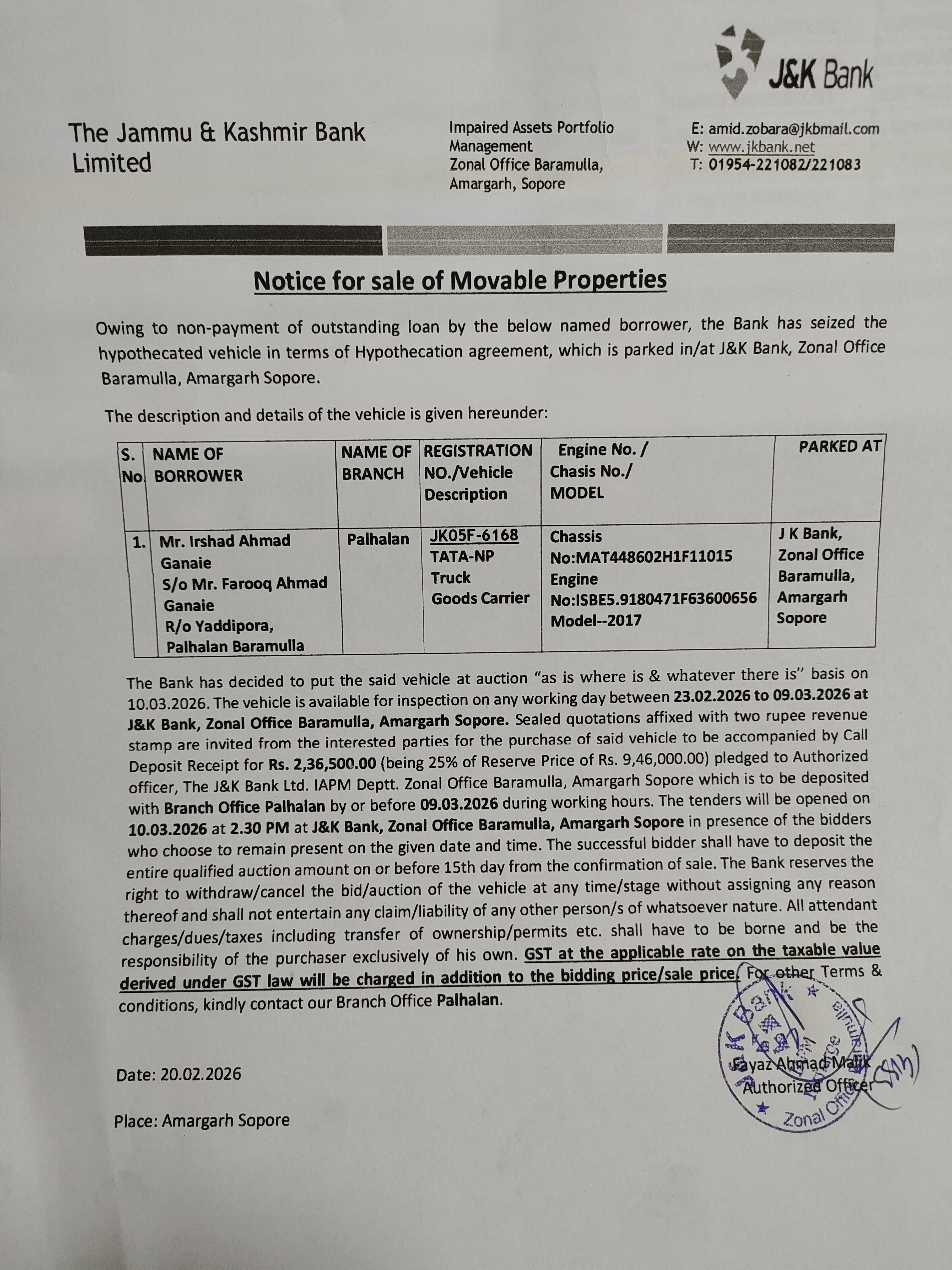 E-auction in NPA account of Mohd Iqbal bhat