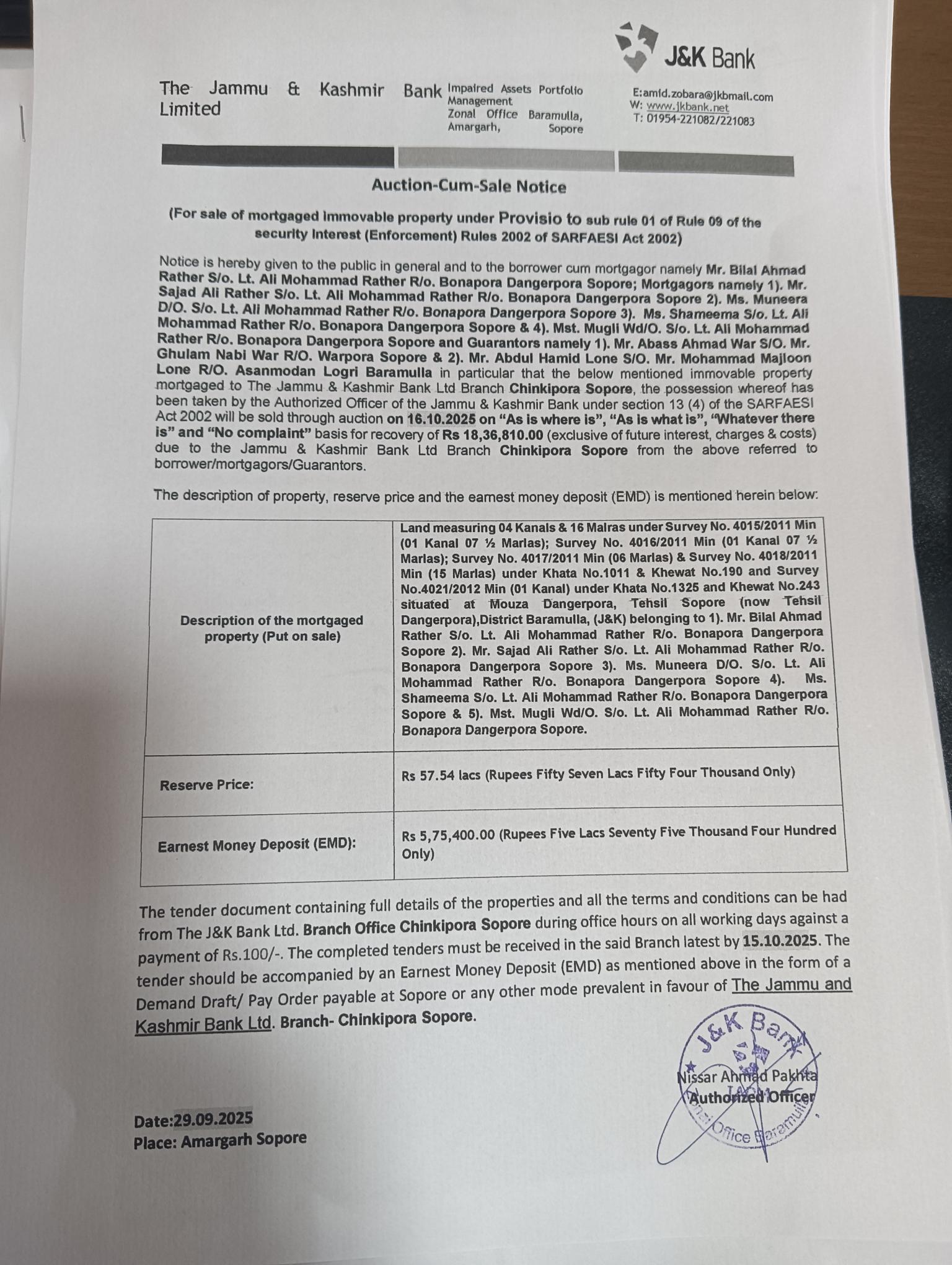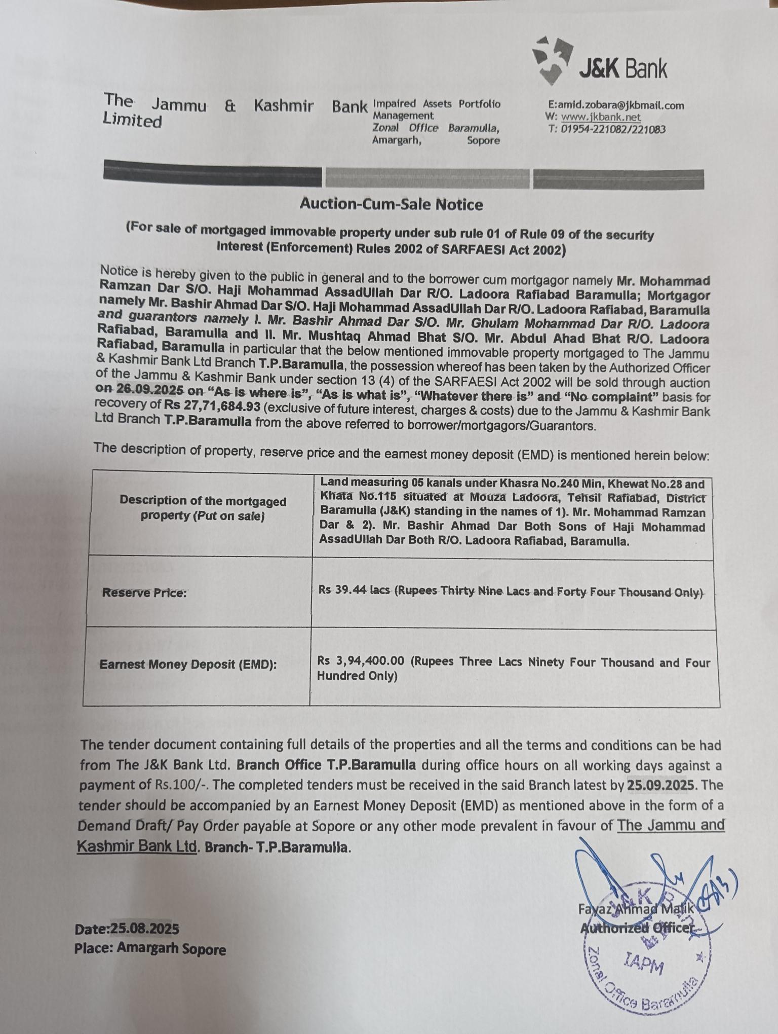 Mr. Mohammad Ramzan Dar of BU T.P.Baramulla – Land Auction Notice
