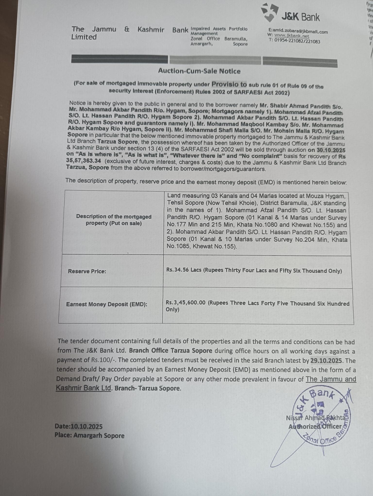 Mr. Shabir Ahmad Pandith of BU Tarzua – Land Auction Notice
