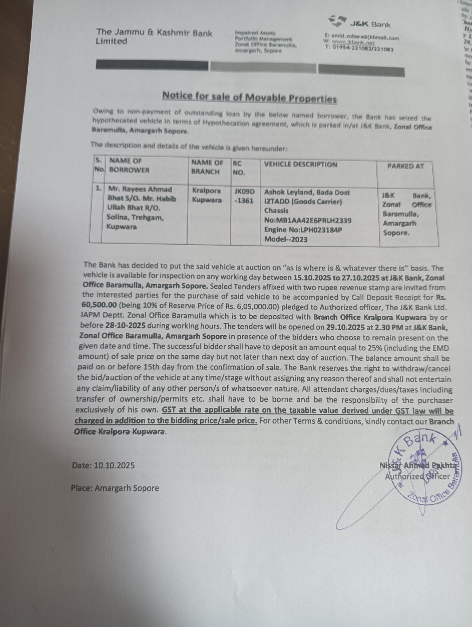 Mr. Rayees Ahmad Bhat of BU Kralpora Kupwara – Vehicle Auction Notice