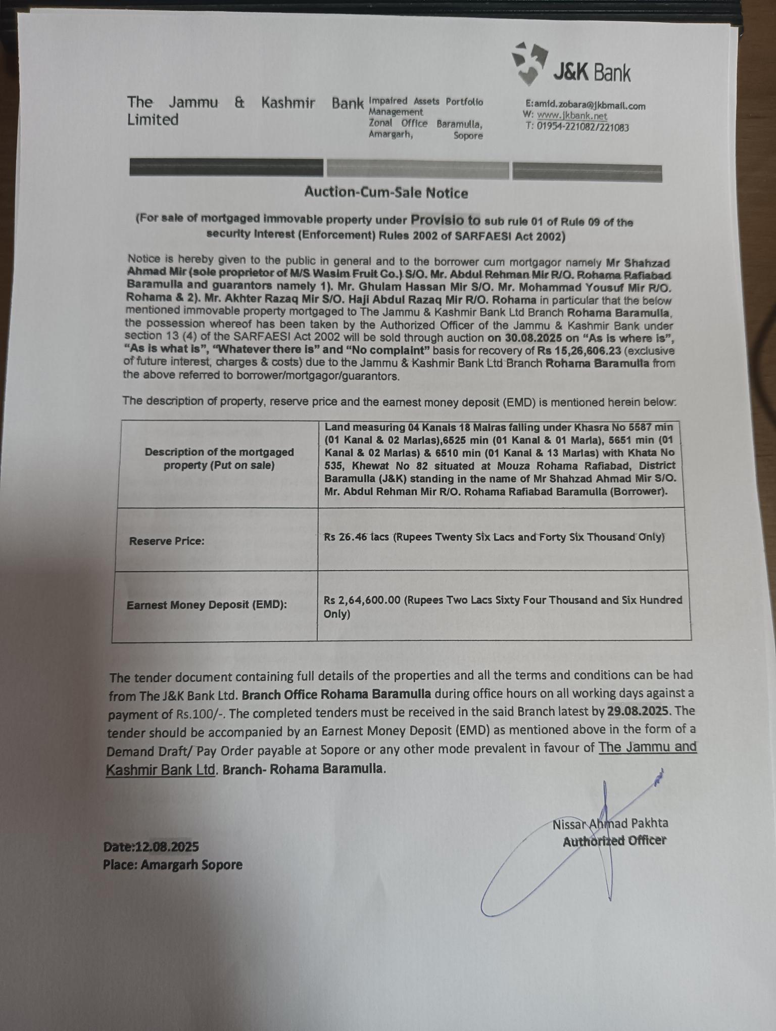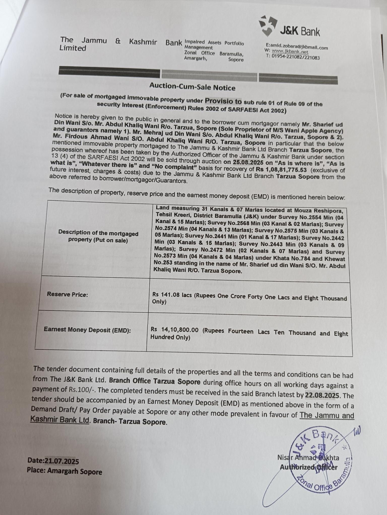 M/S Wani Apple Agency of BU Tarzua – Land Auction Notice