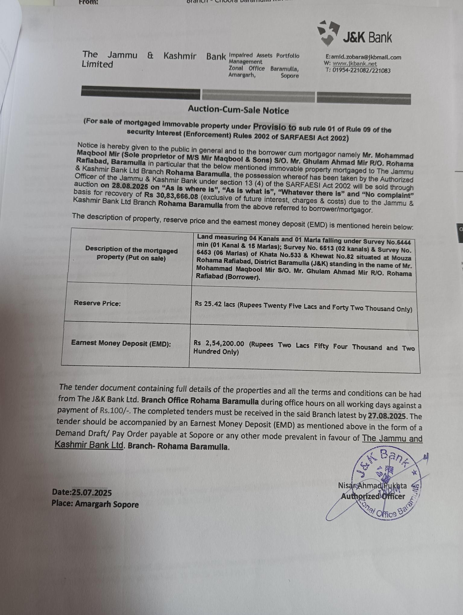 E-auction notices in NPA accounts of M/S Gh Nabi Ali Mohammad (Sole prop. Sheeraz Ahmad Thoker)