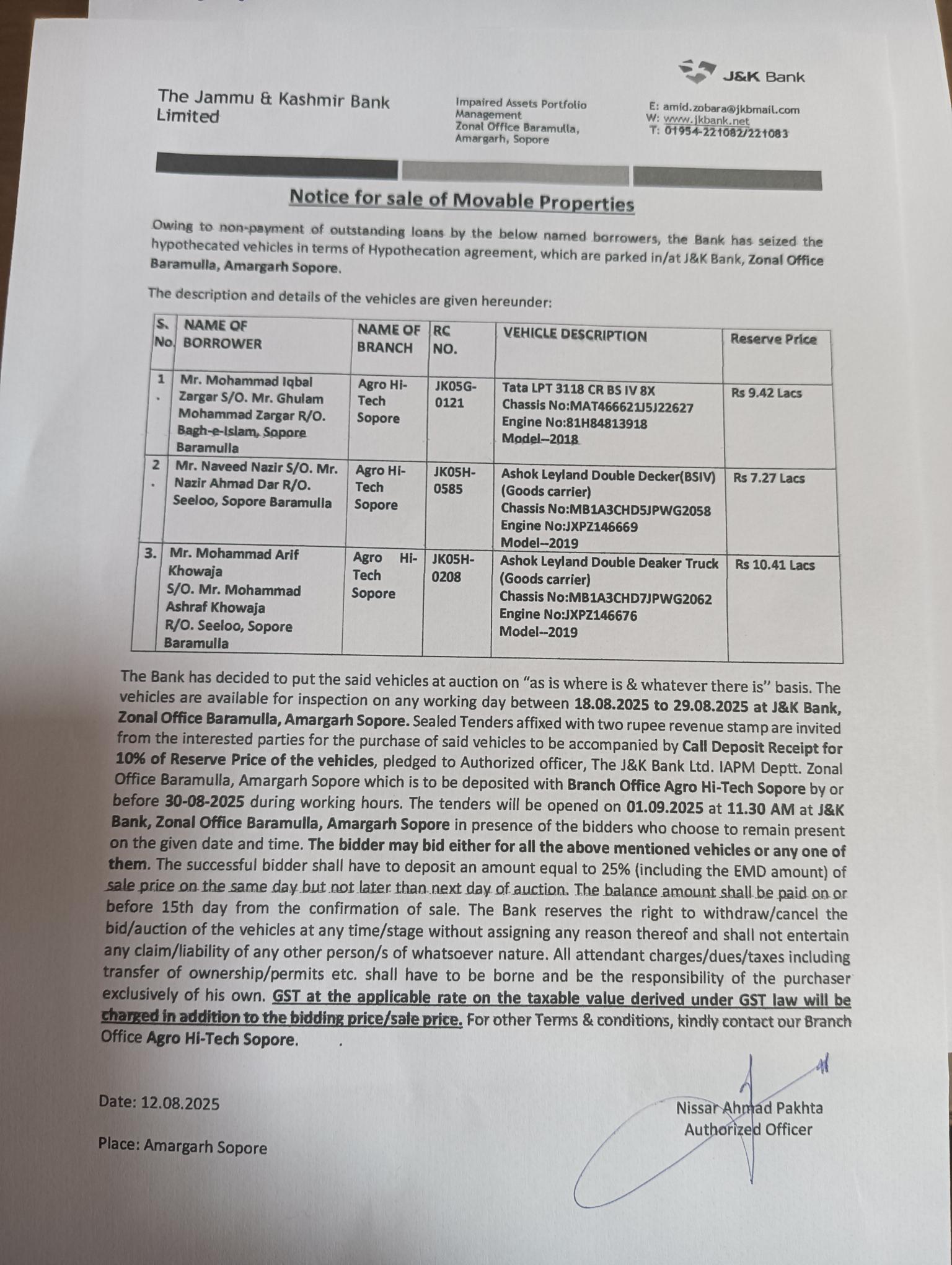 Mr. M.Iqbal Zargar of BU Agro Hitech Sopore, Mr. Naveed Nazir of BU Agro Hitech Sopore, Mr. M.Arif Khawaja of BU Agro Hitech Sopore – Vehicle Auction Notice