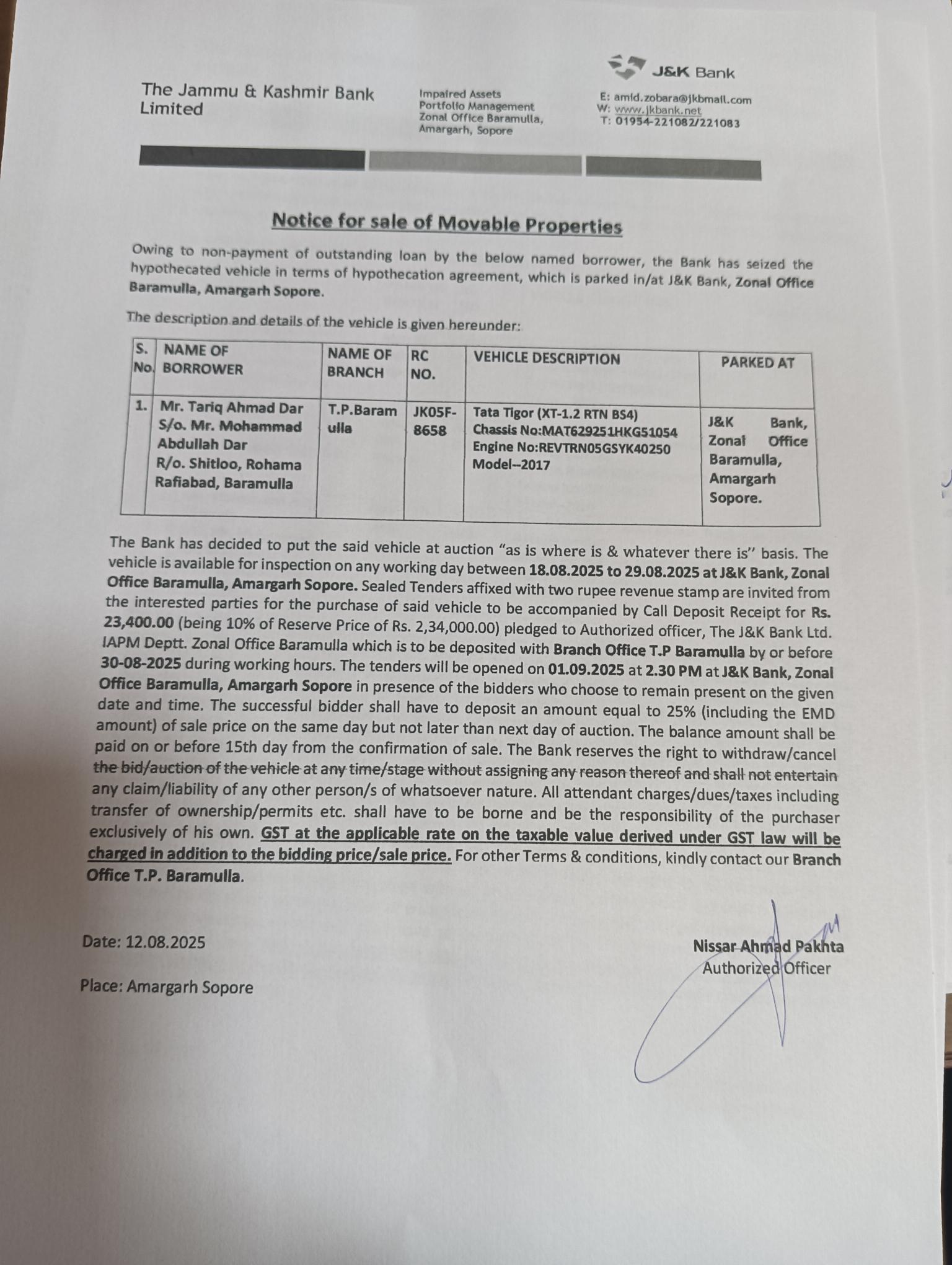 E- auction notice in NPA accounts of M/S Shopian Motors Prop. sakib Bashir Naiko