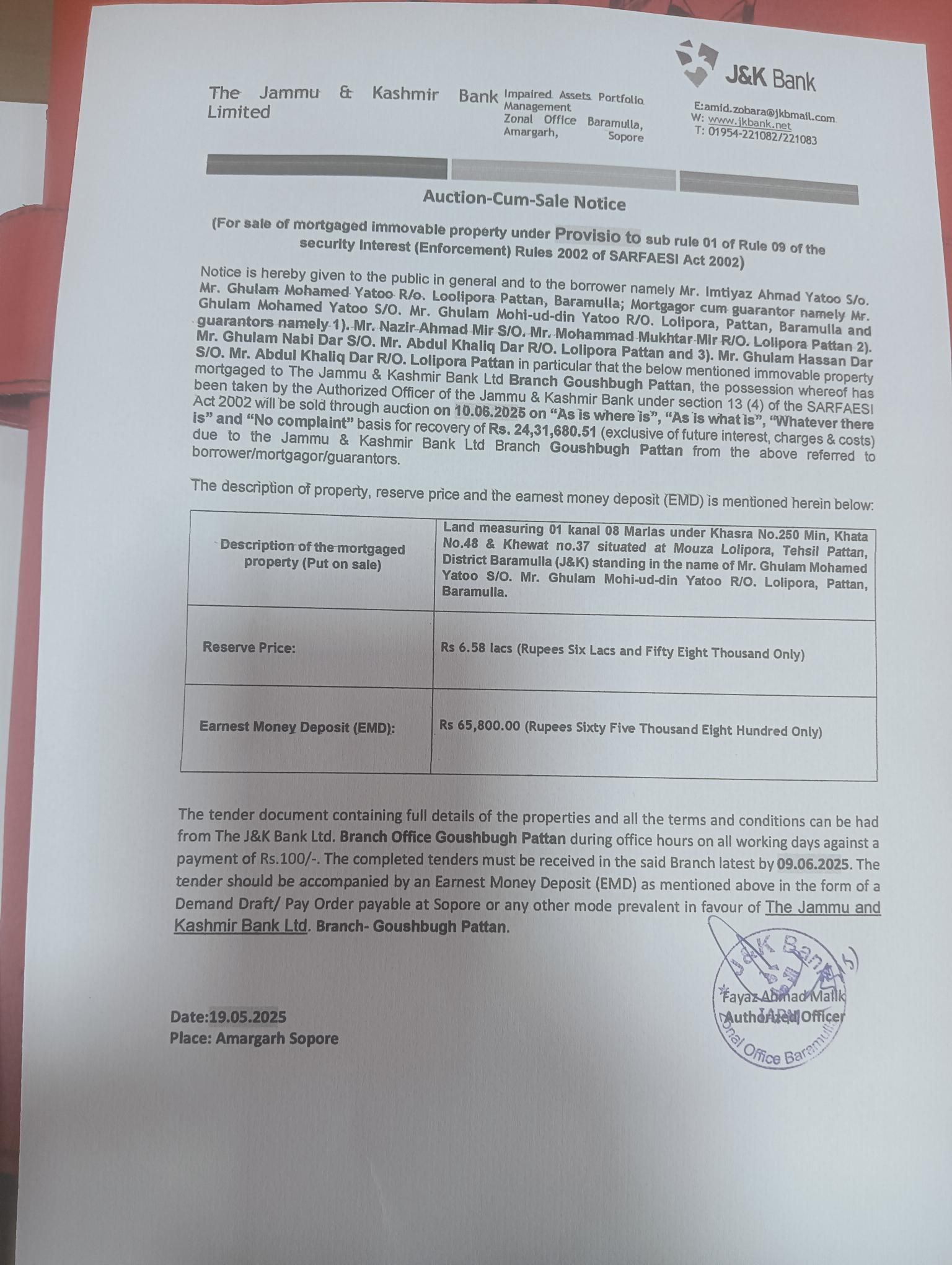 Land Auction Notice: M/S Ab Khaliq Ab Rashid of BU Main Bazar Sopore