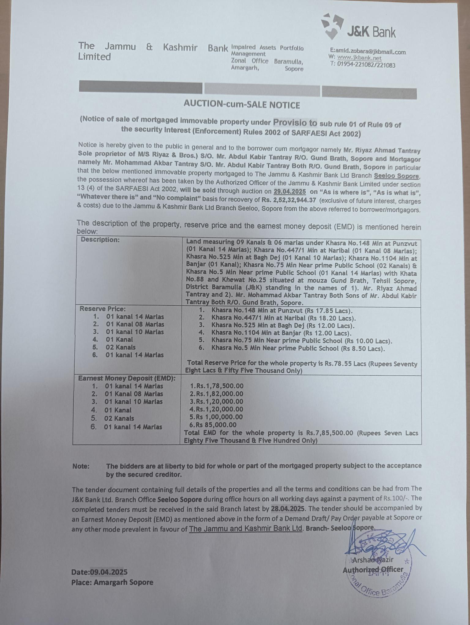 E Auction Notice:Mst. Mehbooba Bano and Mohammad Yaseen Nilla